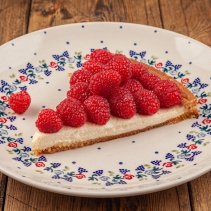 Легкий песочный корж из пшеничной муки и миндальной пудры с нежным кремом из сливочного сыра Креметте, ванилью, свежими ягодами малины и фисташками