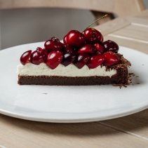 Нежный бисквит из бельгийского темного шоколада с прослойкой из творожного и сливочного крема и шапкой из сочной сладкой черешни