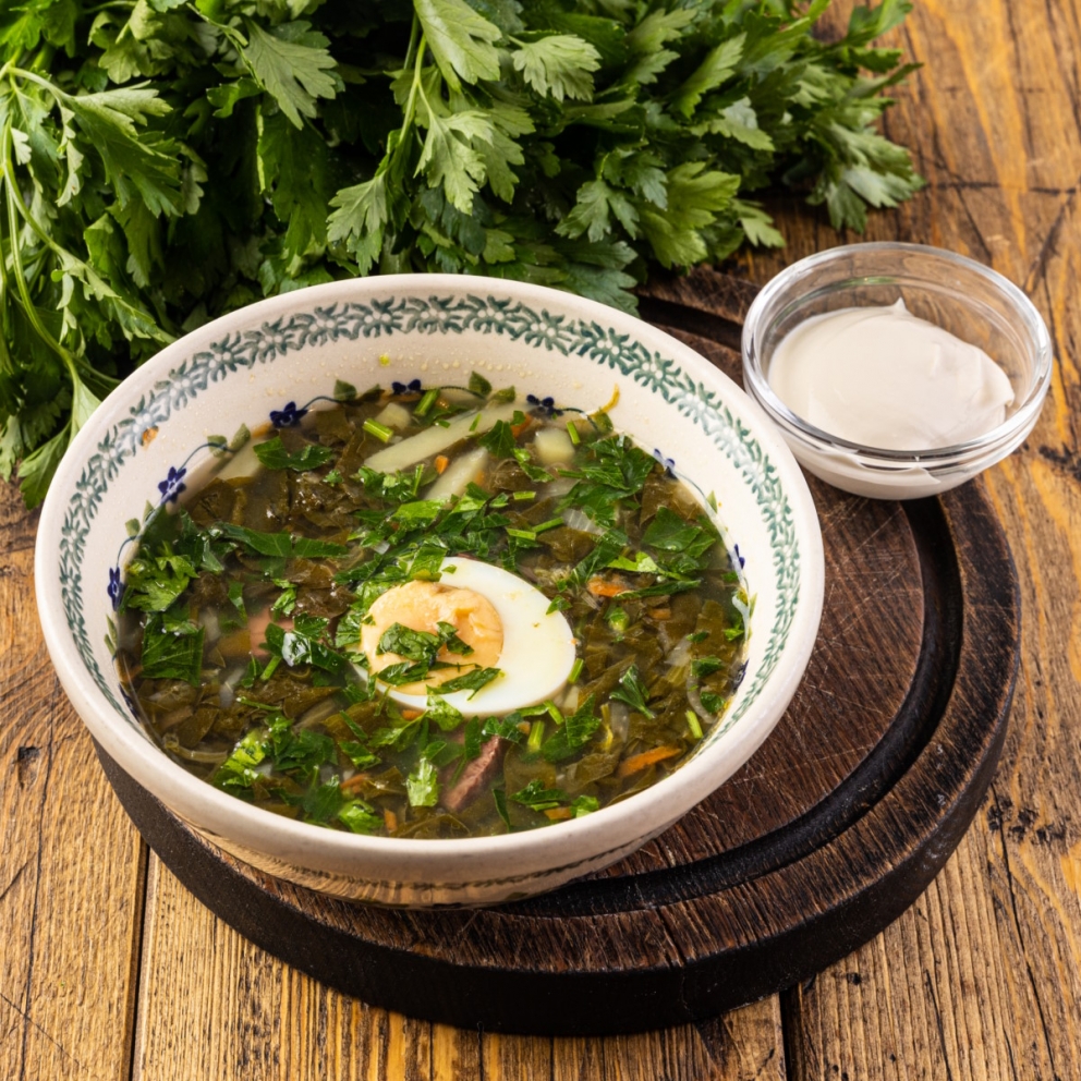 Классический щавелевый суп на говяжьем бульоне с картофелем, морковью, рубленой петрушкой, яйцом и сметаной