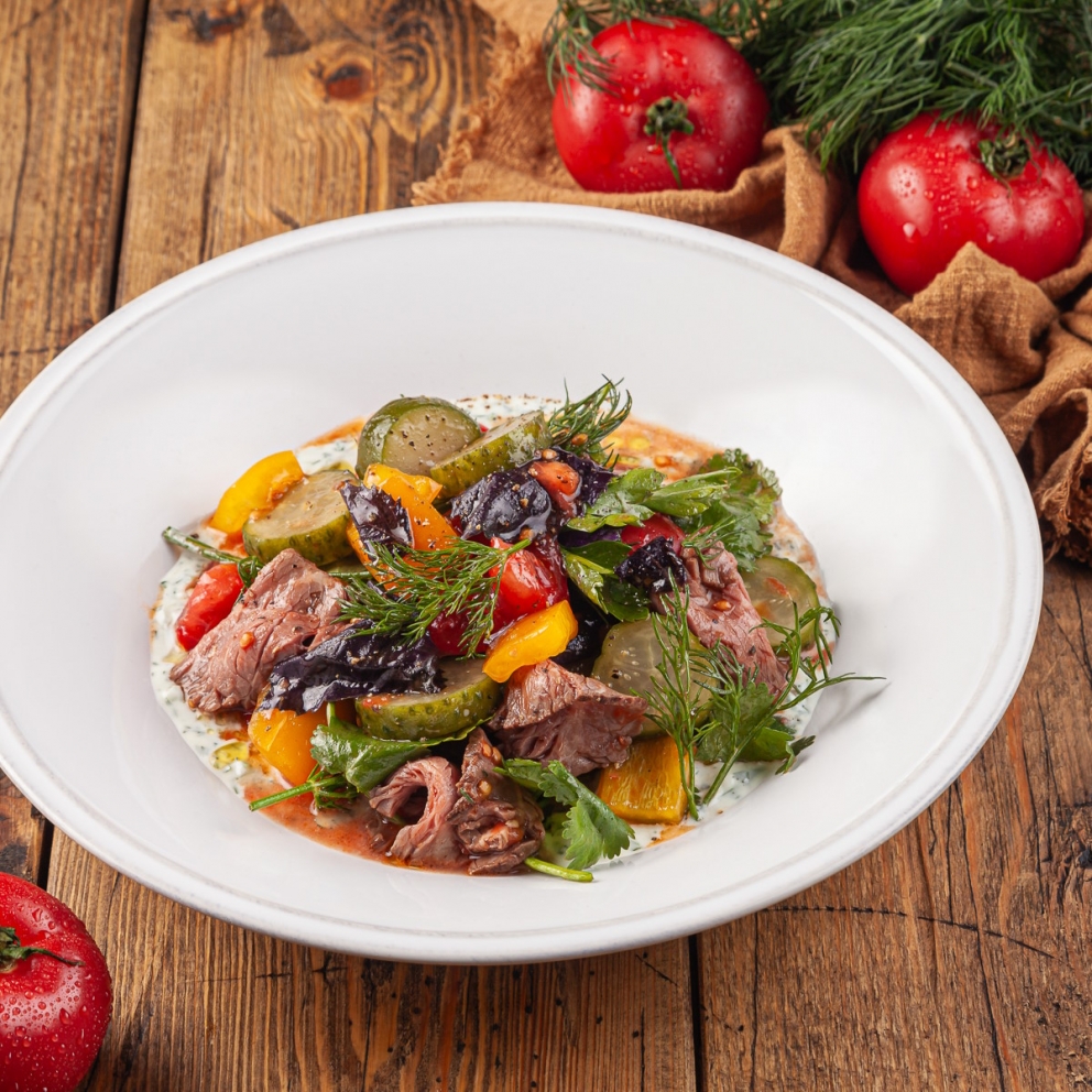 Салат с ростбифом, миксом зелени, малосольными огурцами, болгарским перцем и узбекскими томатами