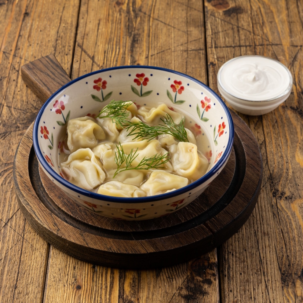 Пельмени отварные с бульоном: бульон куриный (курица тушка, морковь, лук репчатый, масло подсолнечное, соль морская, зелень, перец черный, лавровый лист), пельмени из телятины ((фарш (телятина мякоть, лук репчатый, лед, соль морская), тесто (мука пшеничная в/с, вода питьевая, крахмал кукурузный, соль, масло подсолнечное)), сметана, масло оливковое, укроп