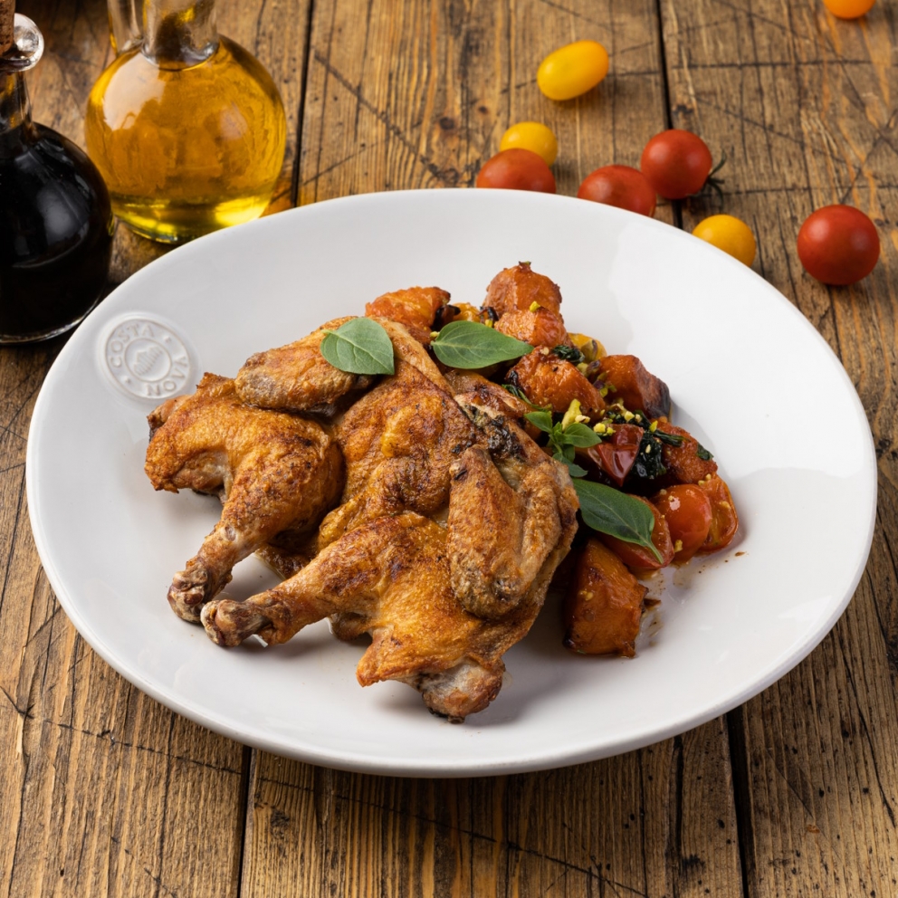 Обжаренный на гриле цыпленок с запеченной тыквой, помидорами черри и фисташками