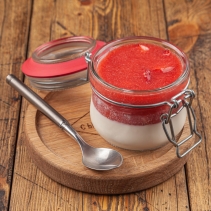 Сливки 35%, молоко 3,2%, сахар песок, ванильный экстракт, желатин листовой, ваниль стручок, соус клубничный (клубника свежая, пудра сахарная), клубника свежая, мята свежая