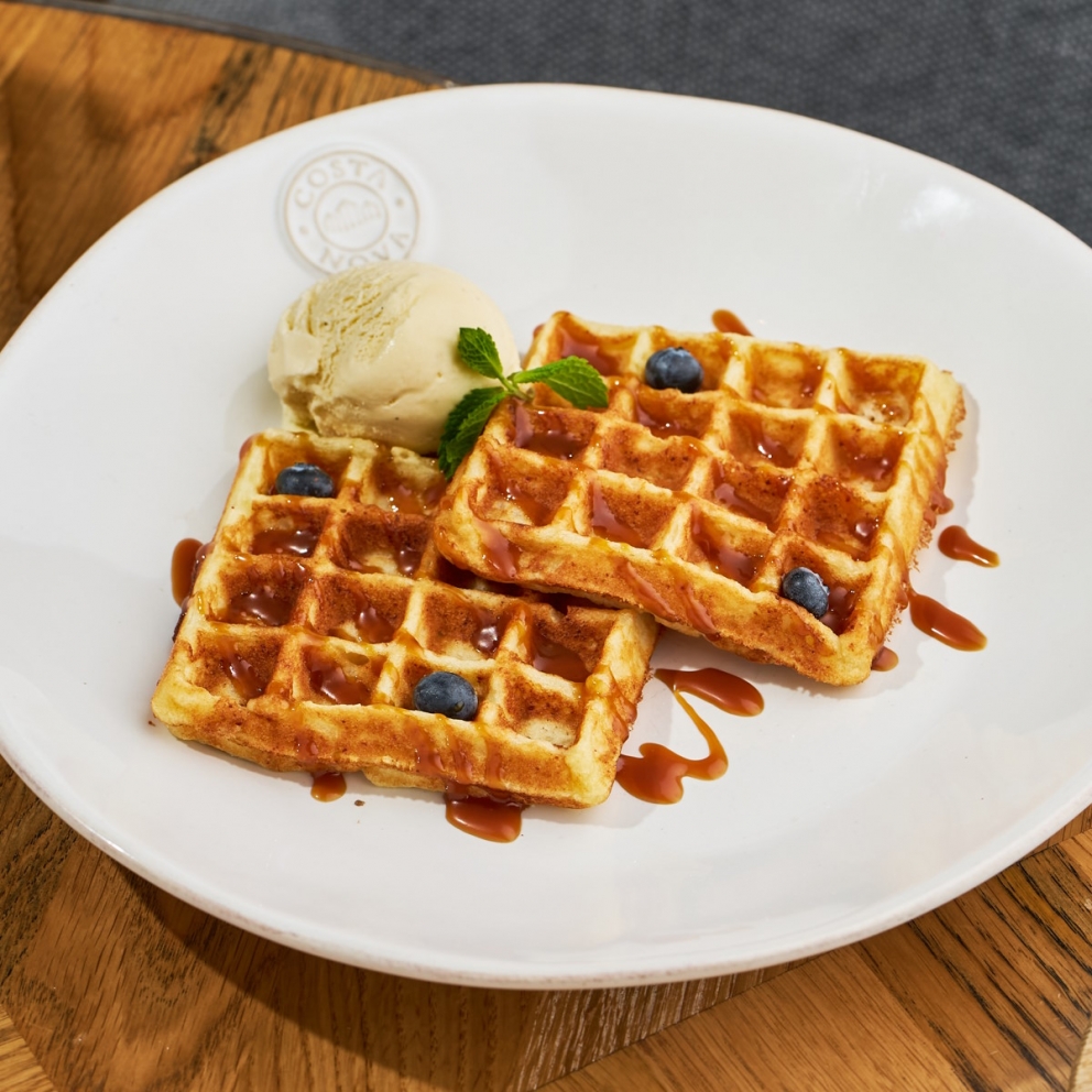 Вафли (риккота, масло сливочное 82%, яйцо куриное, сахар, ванильный сахар, груша, мука пшеничная, молоко, соль), мороженное, карамель, голубика свежая