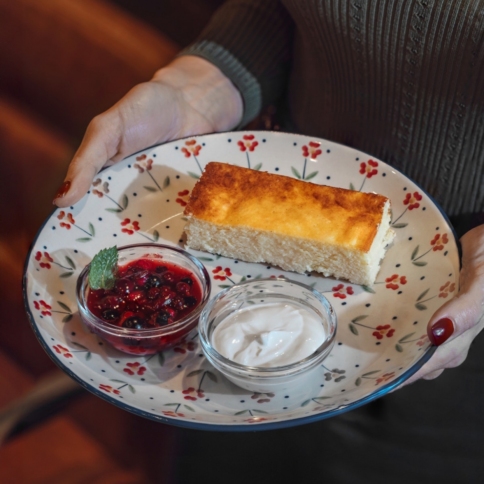 Домашняя творожная запеканка с фермерской сметаной и ягодным соусом