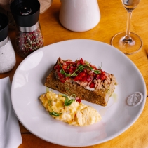 Тост из серого хлеба с тунцом, плавленым сыром, томатами, красным луком, пряными каперсами, соусом песто и скрэмблом из двух яиц