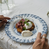 Хрустящий картофельный драник с пастрами, гуакамоле, яйцом пашот и фермерской сметаной