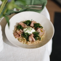 Каша из зеленой гречки с яйцом пашот, соусом демиглас и ростбифом