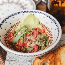 Слабосоленый лосось с огурцами, каперсами, кремом из авокадо, руколой и киноа