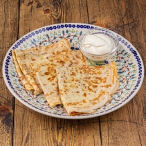 Блины жареные: тесто (молоко 3,2%, яйцо куриное, мука пшеничная в/с, сахар песок, масло подсолнечное, соль морская), сметана
