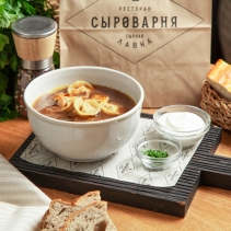 Пельмени из нежной телятины, отваренные в ароматном бульоне из белых грибов