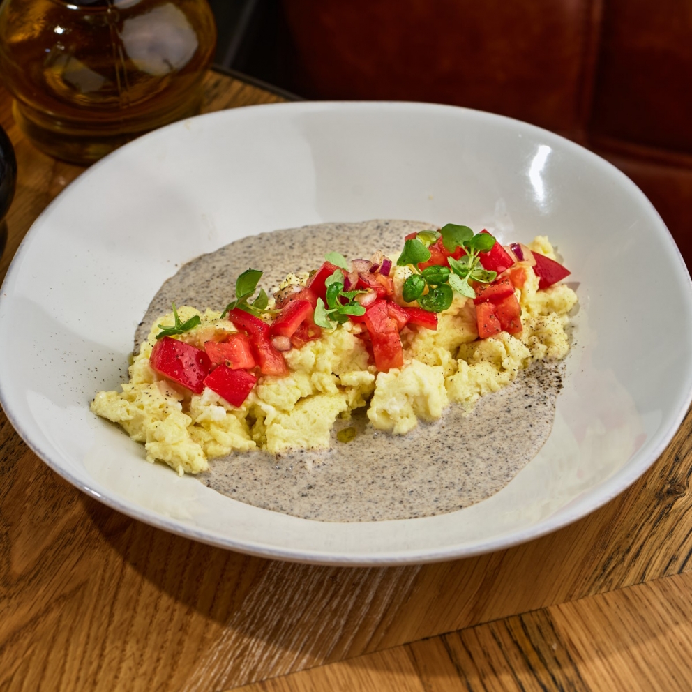 Скрэмбл с трюфельным кремом, томатами и листьями свежего базилика