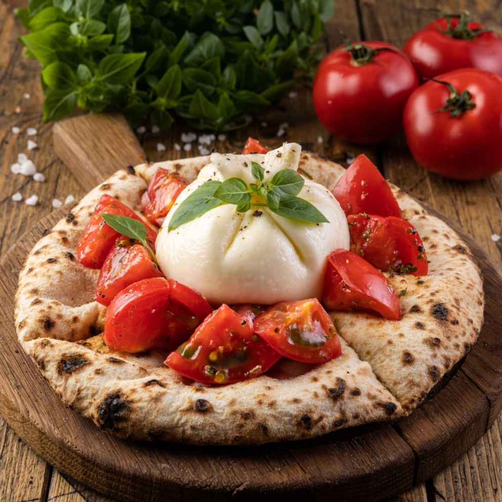 Фокачча из дровяной печи с узбекскими помидорами, красным луком, свежим базиликом, оливковым маслом и сливочной Бурратой