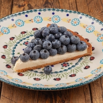Легкий песочный корж из пшеничной муки и миндальной пудры с нежным кремом из сливочного сыра Креметте, ванилью и свежими ягодами голубики