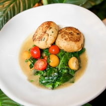Котлеты из филе щуки обжаренные (щука филе, лук репчатый, масло подсолнечное, яйцо куриное, сливки 33%, петрушка, соль морская, перец черный), шпинат, помидоры черри, масло сливочное, масло подсолнечное, соль морская