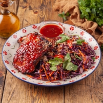Свиные ребра в соусе барбекю с красной капустой, свежей кинзой, миндалем, кунжутом и пикантным чили