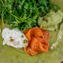 Яйцо пашот с зеленым салатом из шпината, руколы, крем-муссом из авокадо, слабосоленым лососем, фисташками и сушеными томатами