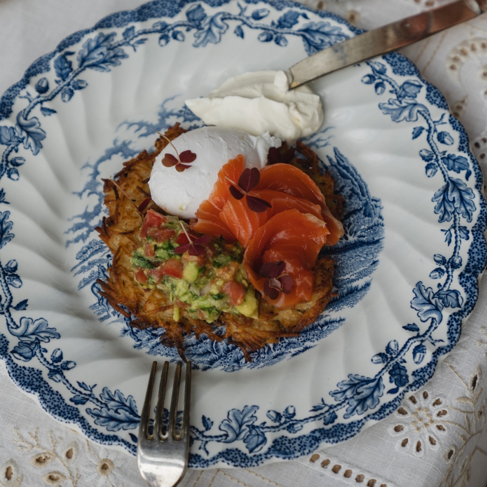 Драник (картофель, сметана, лук, чеснок, масло растительное, яйцо куриное), томаты, сметана, лосось, яйцо глазунья, петрушка