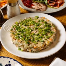 Картофель отварной, морковь отварная, яйца, зеленый горошек, огурцы свежие, огурцы соленые, майонез, говядина отварная