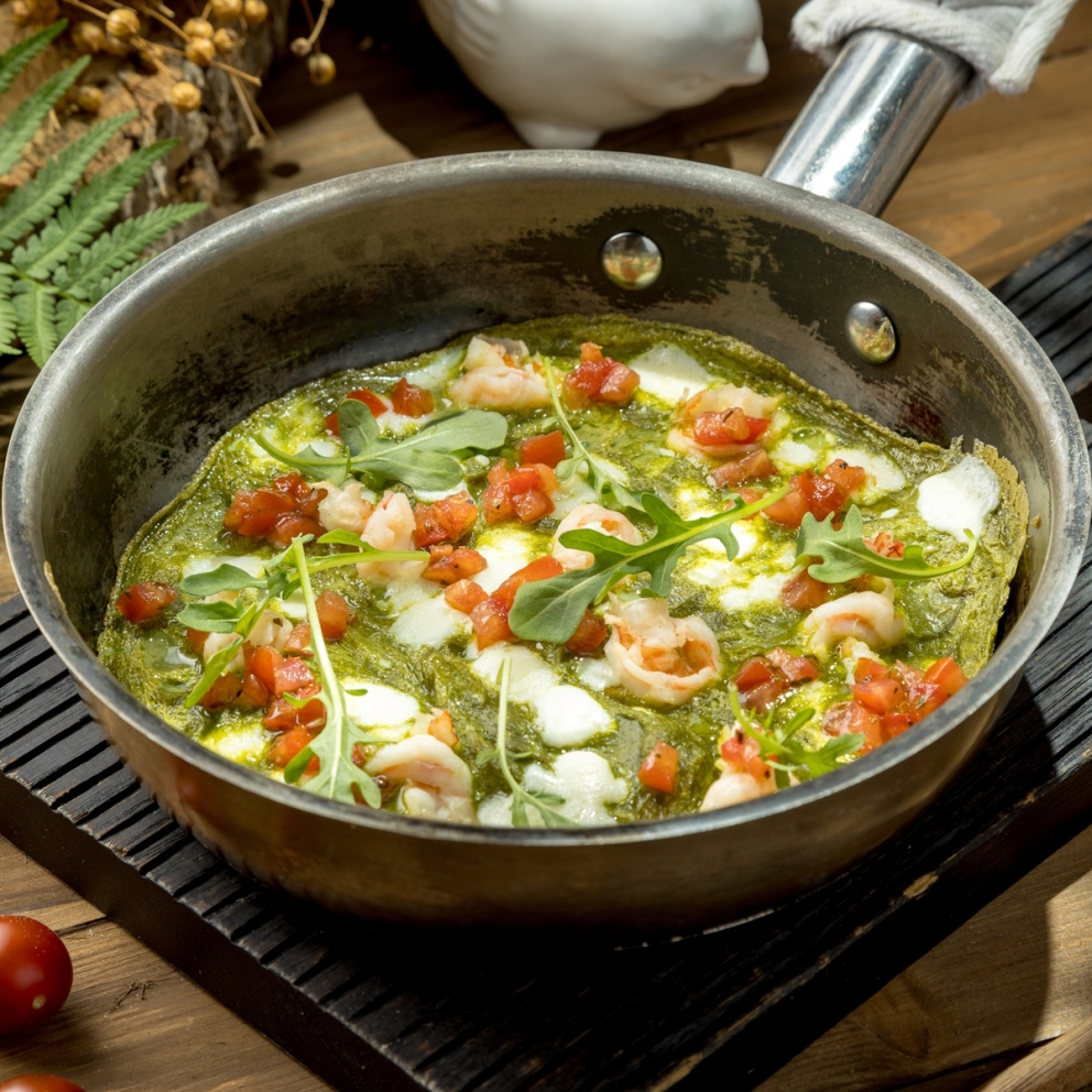 Яйцо, соль, перец, шпинат, масло растительно, креветки, моцарелла, рукола, сушеные томаты, помидоры, чесночное масло, орегано, бальзамический уксус, соль, перец, оливковое масло, петрушка