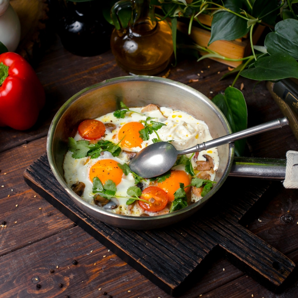 Яичница из трех яиц с грибами и сливочной Страчателлой