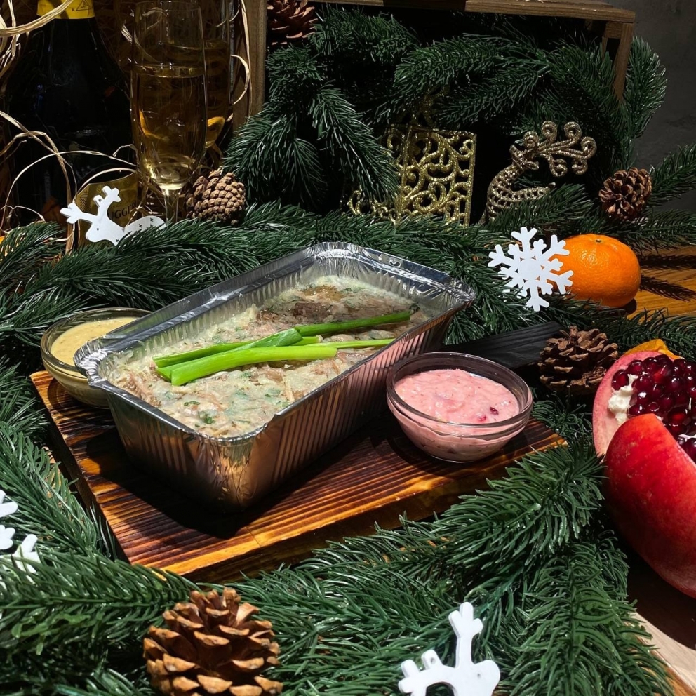 Традиционный холодец из трёх видов мяса, подаётся со сливочным хреном и горчицей