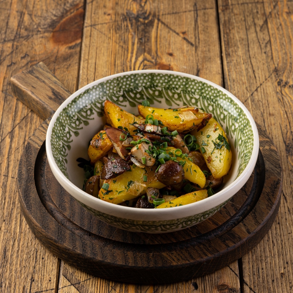 Жаренный на сковороде хрустящий картофель с репчатым луком, чесноком и белыми грибами