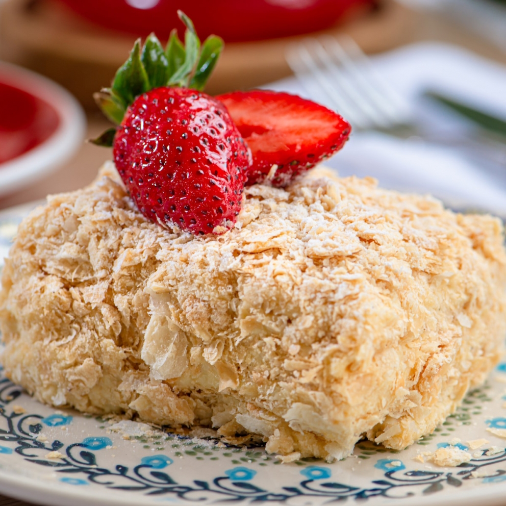 Тесто слоеное бездрожжевое отпеченное, пудра сахарная, крем (молоко 3,2%, сахар песок, молоко сгущенное, мука пшеничная в/с, крахмал кукурузный, масло сливочное 82,5% , сливки 35%, ванилин), малина свежая, гель нейтральный