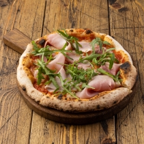 Мини-пицца из дровяной печи со слайсами нежного тамбовского окорока и пряной руколой