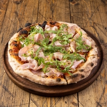 Пицца из дровяной печи со слайсами ароматной Мортаделлы, домашней Страчателлой, руколой, оливковым маслом и фисташками. Сыр Страчателла подается отдельно