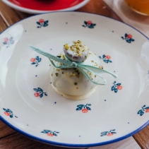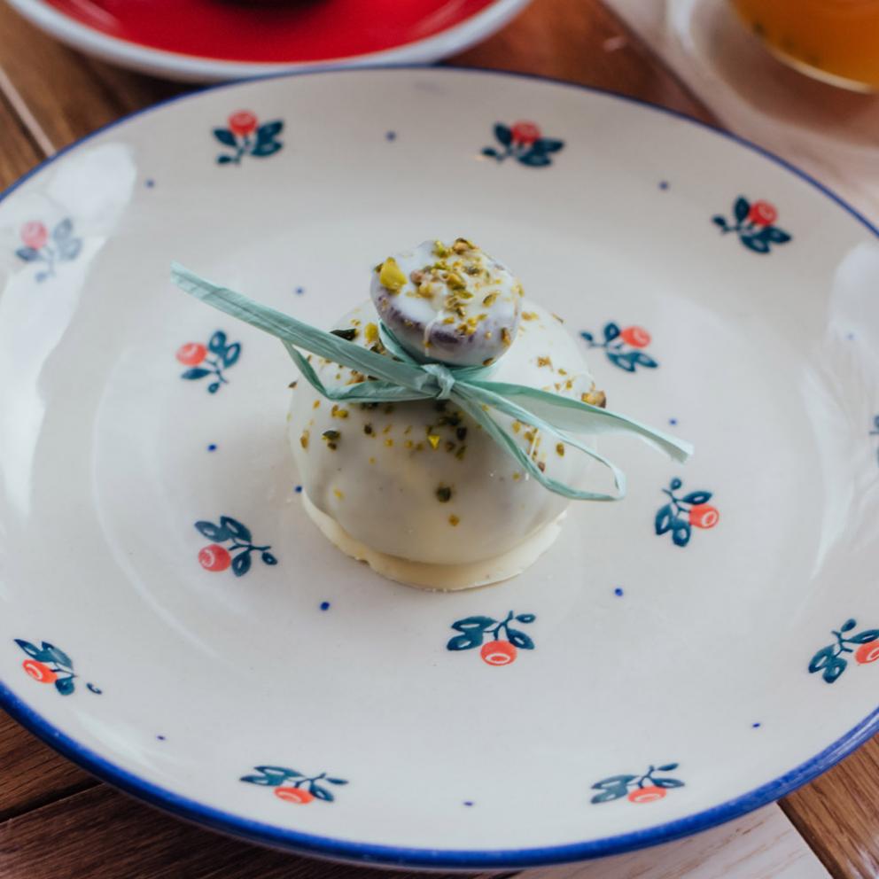Фирменное пирожное картошка в форме нашего сыра с белым шоколадом и фисташками