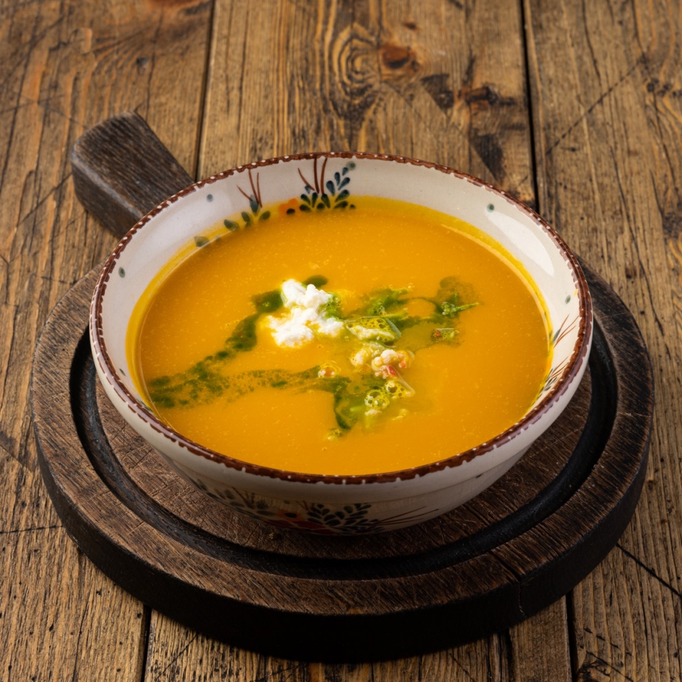Крем-суп из запеченной в дровяной печи ароматной тыквы, с нежной домашней Рикоттой и зеленым маслом