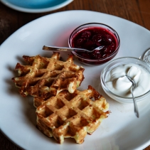 Тесто (кабачок, куриное яйцо, мука, сыр скаморца, разрыхлитель, сметана, соль), сметана 30%, п/ф варенье вишня