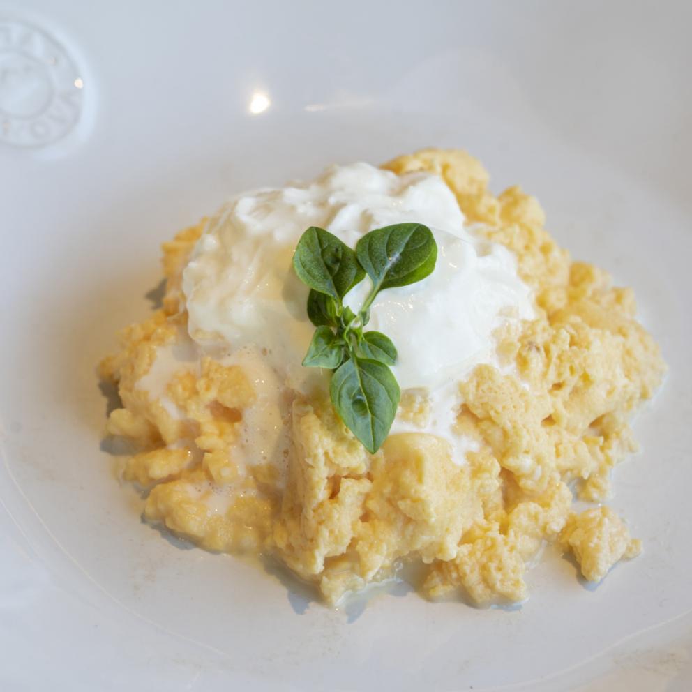 Яйцо куриное, сливки 33%, соль морская, сыр страчателла, базилик