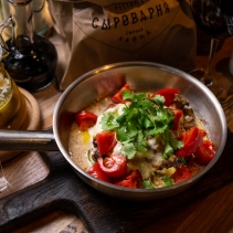 Томленная в вине баранина с кабачком, баклажаном, болгарским перцем и Страчателлой