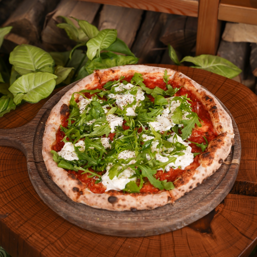 Пицца с домашней Страчателлой, Моцареллой, руколой и оливковым маслом
