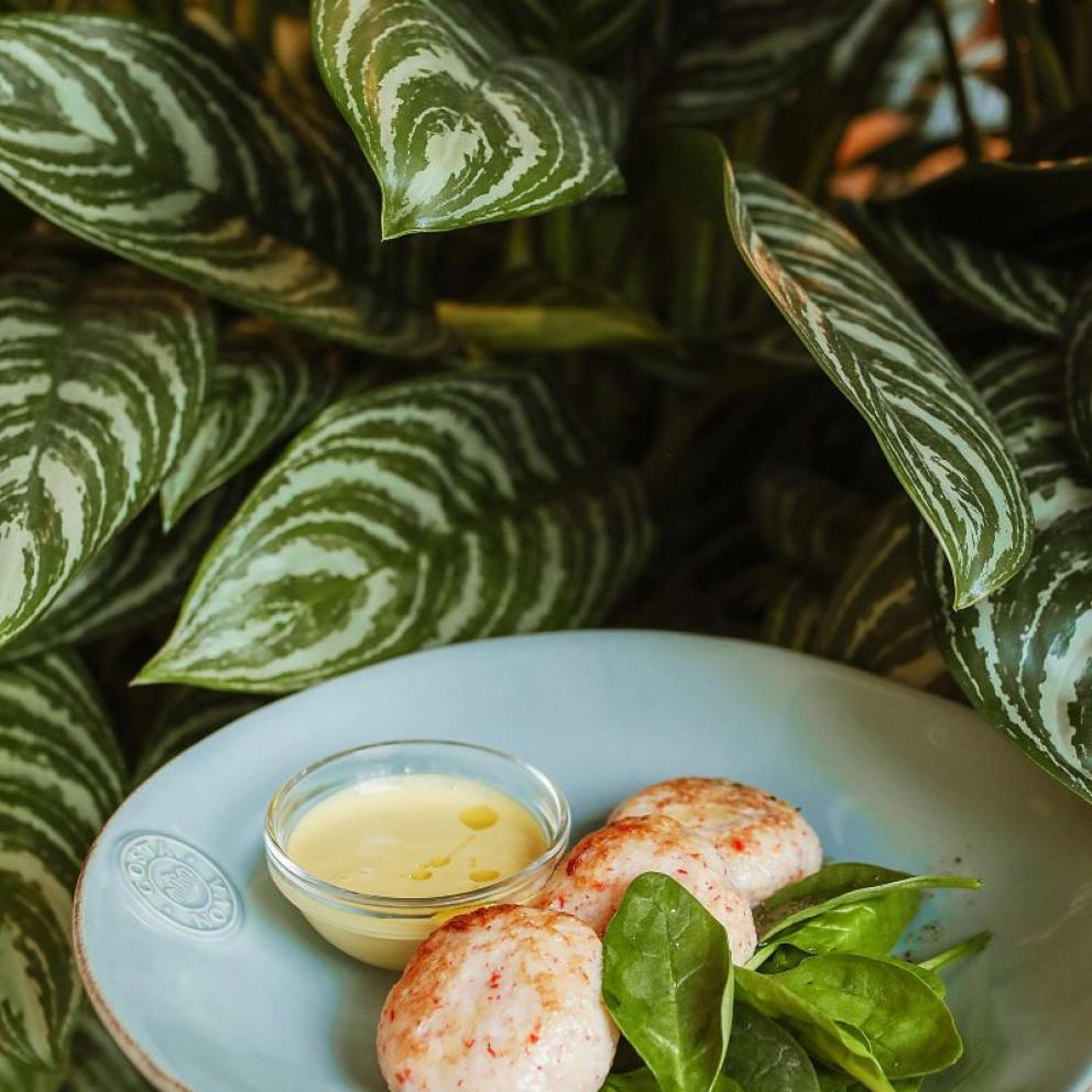 Котлеты из краба и креветок с мини-шпинатом и нежным соусом манго