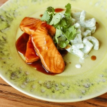 Нежное филе лосося под соусом терияки с гарниром из свежего огурца и соусом из йогурта, мяты и кинзы