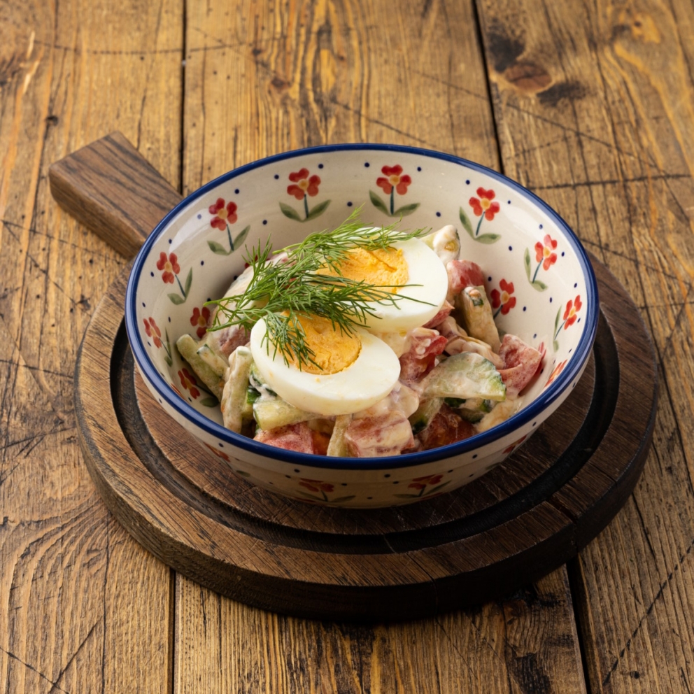 Салат со свежими огурцами, узбекскими томатами, отварным яйцом и фермерской сметаной