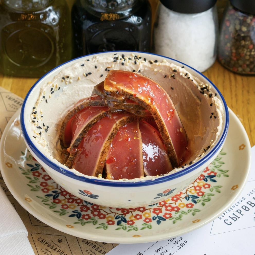Маринованный в соусе свит чили нежный тунец, печеный перец, соус из тунца