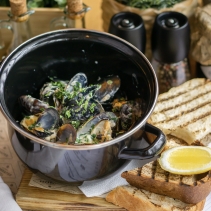 Чилийские мидии в раковине в соусе на основе домашней Страчателлы, сливок, томатов и специй. Посыпаются свежей зеленью и подаются с хлебом и лимоном