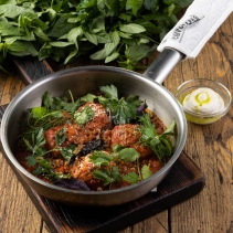 Митболы c фаршем из свинины и говядины, тушенные в томатном соусе, с сырным муссом из домашней Рикотты и миксом свежей зелени