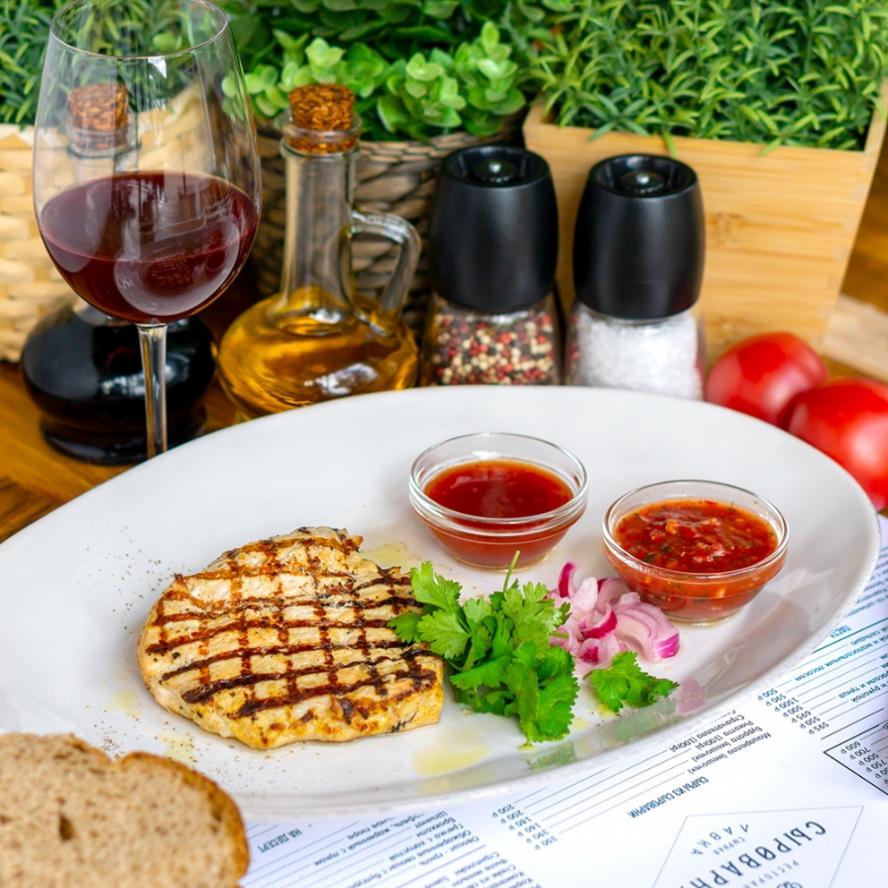 Стейк из свинины, обжаренный на гриле с маринованным крымским луком, домашней аджикой и соусом барбекю
