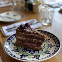 Шоколадные коржи, кокосовый ганаш, вишневый конфитюр, заварной шоколадный крем