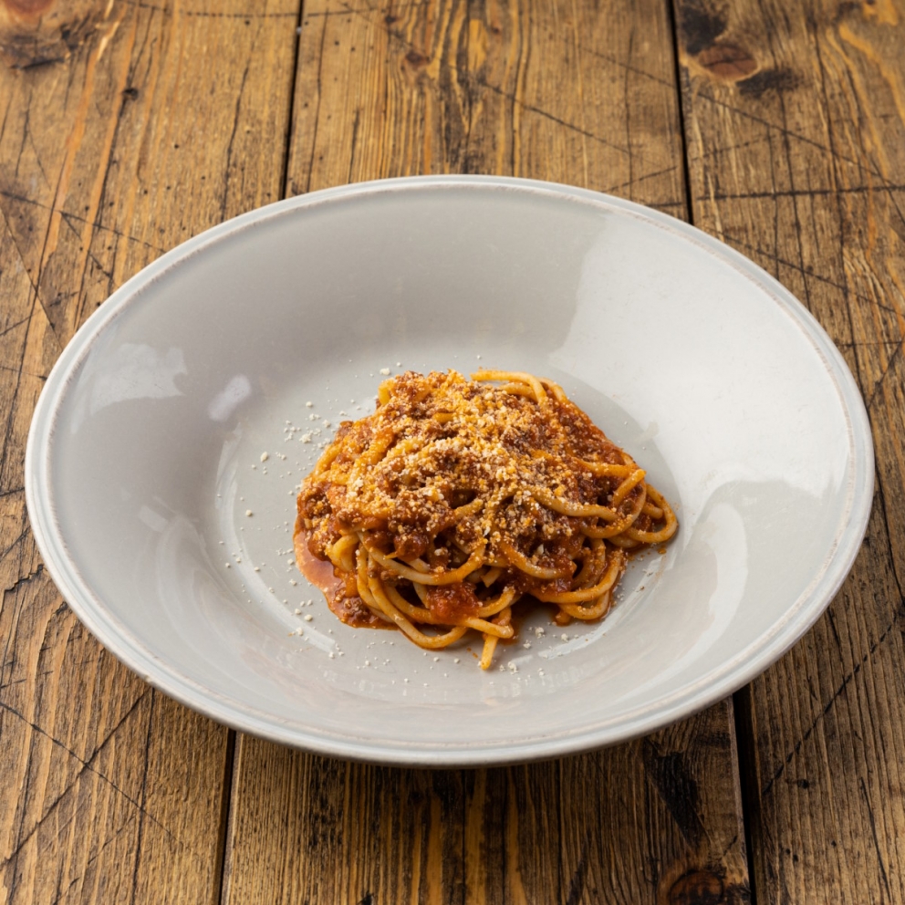 Соус болоньезе (помидоры в собственном соку, говядина лопатка, лук репчатый, масло подсолнечное, морковь, вино красное, стебель сельдерея, паста томатная, соль морская, чеснок, розмарин, перец черный, тимьян, мускатный орех), макаронные изделия отварные, масло сливочное, сыр пармезан
