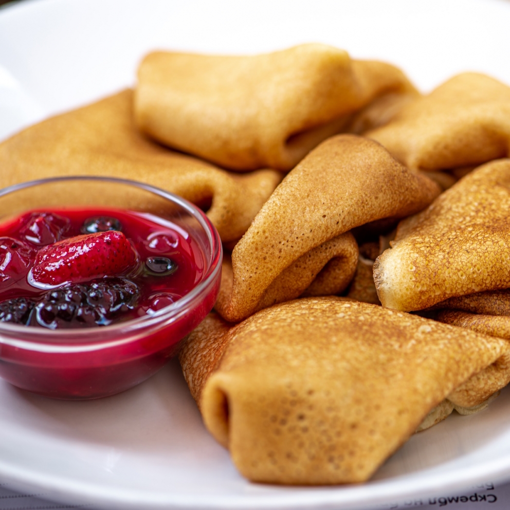 Блины жареные: тесто (молоко 3,2%, яйцо куриное, мука пшеничная в/с, сахар песок, масло подсолнечное, соль морская), соус ягодный