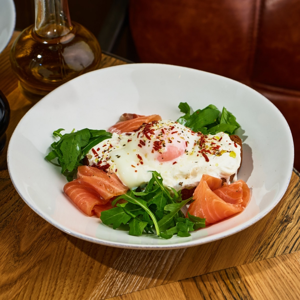 Бутерброд со слабосоленым лососем, сливочной Страчателлой, яйцом пашот и листьями пряной руколы