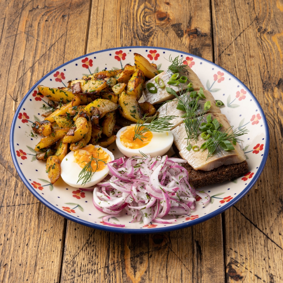 Картофель жареный (картофель, лук репчатый, масло сливочное, масло подсолнечное, чеснок, петрушка, соль морская, перец черный), сельдь филе соленое, хлеб бородинский, лук маринованный (лук красный, укроп, петрушка, соль морская, сумах, перец черный), яйцо куриное отварное, масло подсолнечное, чеснок, лук зеленый, укроп, перец черный