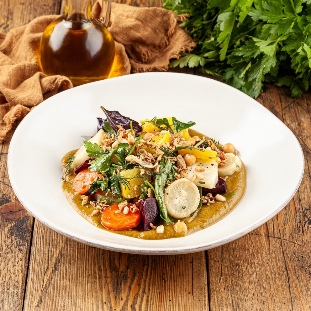Теплый салат из отварной свеклы, запеченной моркови, сельдерея, нута, микса зелени, кедровых орехов и лука фри