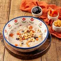 Овсяная каша на миндальном молоке с сухофруктами, медом и фундуком